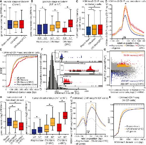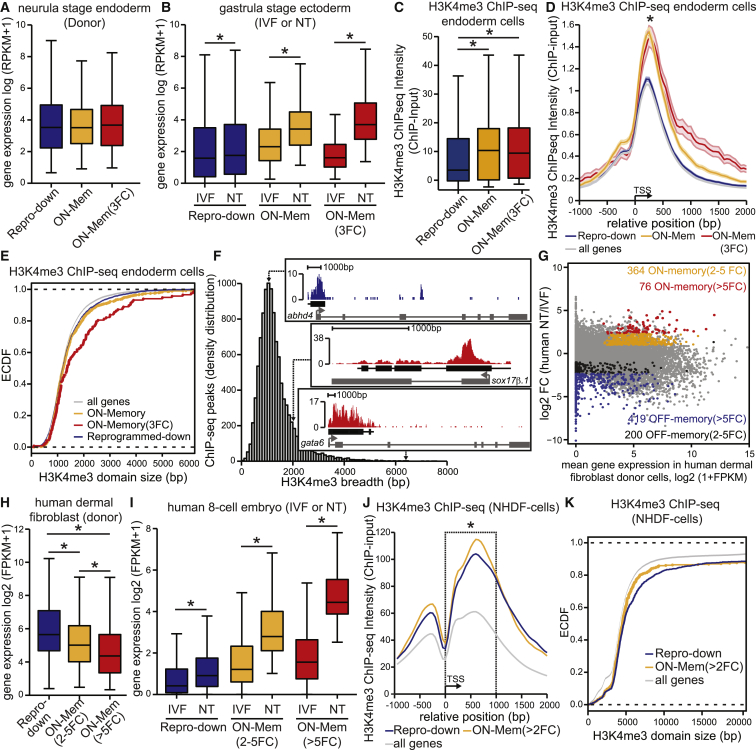 Figure 2. ON-Memory Genes Are Enriched for H3K4me3 in Xenopus and Human Donor Cells(A) Reprogrammed-down, ON-memory, and ON-memory(3FC) genes have similar expression levels in donor-endoderm cells (p values > 0.4, Mann-Whitney test).(B) ON-memory-genes are upregulated in NT cells when compared to IVF ectoderm cells. Boxplot comparing mean expression levels of reprogrammed-down (âp value = 1.024 à 10â7), ON-memory (âp value < 2.2 à 10â16), and ON-memory(3FC)-genes (âp value < 2.2à 10â16); Mann-Whitney test.(CâF) H3K4me3 ChIP-seq data generated from neurula-stage endoderm cells. Read counts are normalized by input and total mapped reads. (C) ON-memory-genes are enriched for H3K4me3 in donor-endoderm cells. Boxplot comparing mean H3K4me3 ChIP-seq intensities in a 4-kb window centered on the TSS (âp value < 0.001, KS test). (D) TSS metaplots of H3K4me3 ChIP-seq intensity in endoderm cells. ON-memory(3FC) and ON-memory ChIP-seq intensities are higher when compared to reprogrammed-down genes (p value = 0.07 and âp value = 0.001, respectively KS test). (E) ON-memory(3FC)-genes show increased H3K4me3 breadth when compared to reprogrammed-down genes (p value = 0.0002, KS test). Empirical cumulative distribution function (ECDF) comparing H3K4me3 domain size spanning the TSS. (F) Breadth distribution of H3K4me3 ChIP-seq peaks. Inserts are examples of H3K4me3 regions of a reprogrammed-down gene (abhd4) and ON-memory genes sox17β.1 and gata6(NM_001087983.1).(G) MA plot comparing gene expression between human NT and IVF embryos. The average log2 FC in expression of transcripts in NT embryo over IVF embryos (n = 1; pool of five NT and of five IVF 8-cell embryos) is plotted on the y axis, and the mean log2 (1+FPKM) gene expression in the endoderm donor cells (1 sample of the donor dermal fibroblast cells, DFB-8) is plotted on the x axis. Gray, all identified transcripts; orange, ON-memory(2-5FC); black, OFF-memory(2-5FC); red, ON-memory(> 5FC) genes; blue, OFF-memory(> 5FC) genes.(H) Boxplot comparing mean expression levels of reprogrammed-down, ON-memory(2-5FC), and ON-memory(> 5FC) genes in DFB-8 donor cells (âp values < 0.002, Mann-Whitney test).(I) ON-memory genes are upregulated in eight-cell NT embryos when compared to IVF embryos. Boxplot comparing mean expression levels of reprogrammed-down, ON-memory(2-5FC), and ON-memory(> 5FC) genes (âp values < 2.2à 10â16) in eight-cell NT and IVF embryos; statistical test: Mann-Whitney test.(J and K) H3K4me3 ChIP-seq datasets of H3K4me3 in human dermal fibroblast cells (NHDF-cells) were obtained from the ENCODE project (Consortium, 2012). (J) TSS meta-plots of the average intensity of H3K4me3 modifications in NDHF cells for reprogrammed-down, ON-memory(> 2FC), and all genes of the human genome. ON-memory(> 2FC) ChIP-seq intensities are significantly higher when compared to reprogrammed-down genes (âp value < 0.035, 1 kb window around the TSS, KS test). (K) ECDF comparing H3K4me3 domain size around the TSS of reprogrammed-down, ON-memory(> 2FC), and all genes from the human genome. ON-memory(> 2FC)-genes do not show a significant increase in H3K4me3 breadth when compared to reprogrammed-down genes (p value = 0.85, KS test; ChIP-seq peaks called by MACS2).Boxplots: middle line in the box indicates the median; box edges indicate 25th/75th percentiles; and whiskers indicate min and max. See also Figures S2 and S4 and Table S2.