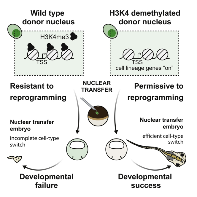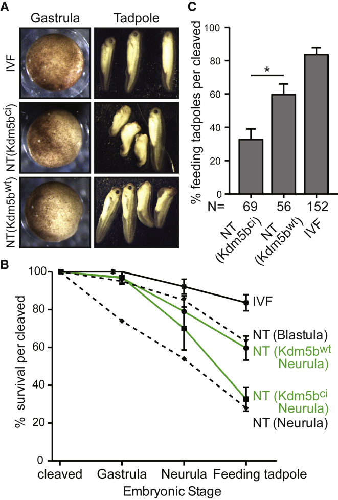 Figure 4. H3K4 Demethylation in Donor Nuclei Improves the Development of NT Embryos(A) IVF, NT(Kdm5bci), and NT(Kdm5bwt) embryos at the gastrula and tadpole stages.(B) The development of IVF, NT(Kdm5bci), and NT(Kdm5bci) gastrula embryos (stage 10.5) was followed until feeding tadpole stage (green lines and black solid line, respectively). Black dashed lines indicate the developmental potential of NT embryos generated from uninjected blastula stage or neurula stage endoderm nuclei (data from Gurdon, 1960). y axis is the percentage of gastrula embryos reaching the indicated stages.(C) Kdm5bWT expression in the donor cell improves the development of NT embryos to the feeding tadpole stage. Bar graph showing the percentage of cleaved gastrula embryos reaching the feeding tadpole stage (âp value = 0.0007, paired t test, one-tailed). Data are presented as mean ± SEM.See also Figure S4 and Table S1.