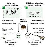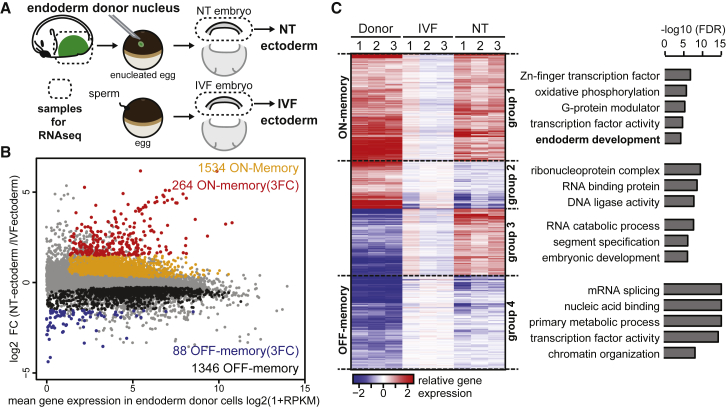 Figure 1. Donor Cell-Type-Specific Genes Are Expressed in the Wrong Cell Type of NT Embryos(A) Design of NT experiments.(B) MA plot comparing gene expression between ectoderm of NT and IVF embryos. The average log2 FC in expression of transcripts in NT embryos over IVF embryos is plotted on the y axis, and the mean log2 (1+RPKM) gene expression in the donor endoderm cells is plotted on the x axis. Gray, all transcripts; orange, ON-memory genes; black, OFF-memory genes; red, ON-memory(3FC) genes; blue, OFF-memory(3FC) genes.(C) Heatmap showing 4,504 differentially expressed transcripts obtained by pairwise comparison between donor endoderm cells and IVF and NT ectoderm cells. Rows are log2 FC in expression over mean expression levels in IVF. Hierarchical clustering of rows classified those genes into four groups. Gene ontology analysis revealed that ON-memory genes are enriched for genes important for endoderm development; FDR, false discovery rate; FC, fold change.See also Figures S1 and S4 and Tables S1 and S2.