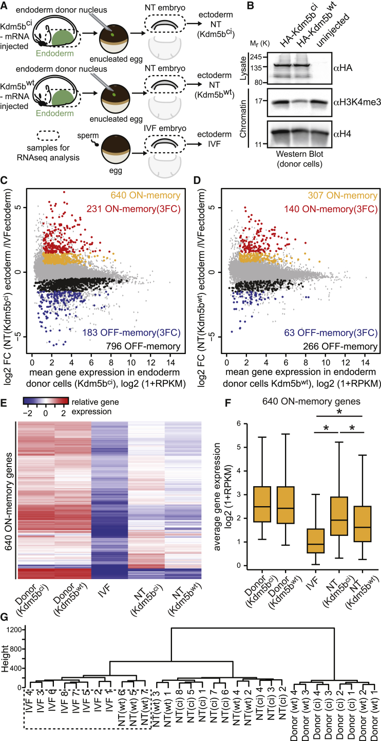 Figure 3. Kdm5b Expression in the Donor Nuclei Reduces H3K4me3 Levels and Improves Reprogramming in NT Embryos(A) Design of NT experiments.(B) Western blot analysis indicating that Kdm5bWT expression reduces H3K4me3 by â70% in neurula-stage embryos, when compared to uninjected ones.(C and D) Kdm5bwt expression in the donor cells reduces the number of misregulated genes in NT embryos when compared to IVF embryos. MA plot comparing gene expression between NT(Kdm5bci) and IVF ectoderm cells (C) or NT(Kdm5bwt) and IVF ectoderm cells (D). Average log2 FC in expression of transcripts in NT over IVF ectoderm cells is plotted on the y axis, and the mean log2 (1+RPKM) gene expression in the donor-endoderm cells is plotted on the x axis. Gray, all transcripts; orange, ON-memory genes; black, OFF-memory genes; red, ON-memory(3FC)genes; blue, OFF-memory(3FC) genes.(E) ON-memory gene expression is reduced in NT(Kdm5bwt) embryos. Heatmap showing the expression of ON-memory genes identified in NT(Kdm5bci) embryos in donor-endoderm cells in IVF, NT(Kdm5bci), and NT(Kdm5bwt) ectoderm cells. Rows represent log2 FC in expression of the indicated samples over mean pooled expression levels of all samples. Rows were sorted by hierarchical clustering.(F) Boxplots comparing mean expression levels of ON-memory transcripts in donor-endoderm cells and IVF, NT(Kdm5bci), and NT(Kdm5bwt) ectoderm cells. (âp values < 0.0004, Mann-Whitney test.)(G) Hierarchical transcriptome clustering analysis of filtered and normalized RNaseq data of single ectoderm tissues of IVF, NT(Kdm5bwt), and NT(Kdm5bci) embryos, as well as donor endoderm cells.Boxplots: middle line in the box indicates the median; box edges indicate 25th/75th percentiles; and whiskers indicate min and max. See also Figures S2âS4 and Tables S1 and S3.