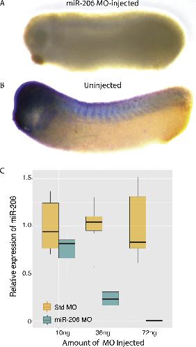 Fig. 2. miR-206 morpholino specifically knocks down endogenous miR-206 levels. (A) miR-206 whole mount in situ hybridization in stage 28 embryo injected with 72 ng of miR-206 morpholino at the one-cell stage. (B) Control, miR-206 whole mount in situ hybridization in stage 28 uninjected embryo. (C) Box plot showing the relative expression levels of miR-206 calculated by quantitative RT-PCR in stage 28 embryos injected at the one-cell stage with variable amounts of either standard or miR-206 morpholinos.