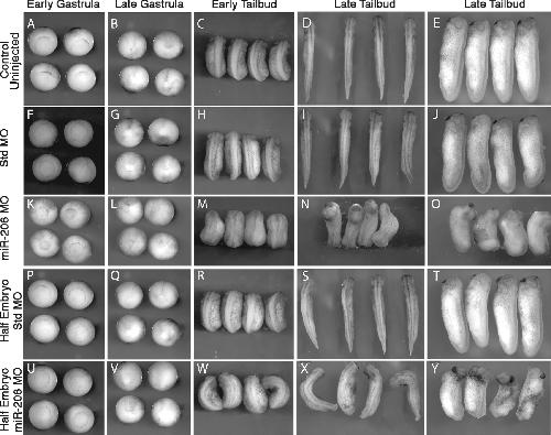 Fig. 3. Temporal analysis of miR-206 morphant embryos. Images of live uninjected embryos (A-E), embryos injected at the one-cell stage with standard MO (F-J) or miR-206 MO (K-O), and embryos injected at the two-cell stage in only one blastomere with standard MO (P-T) or miR-206 MO (U-Y). The first two columns show a blastoporal view, the third and fourth column show a dorsal view (head up), and the fifth column shows a lateral view (head up, ventral left). Magnification: 10 × .