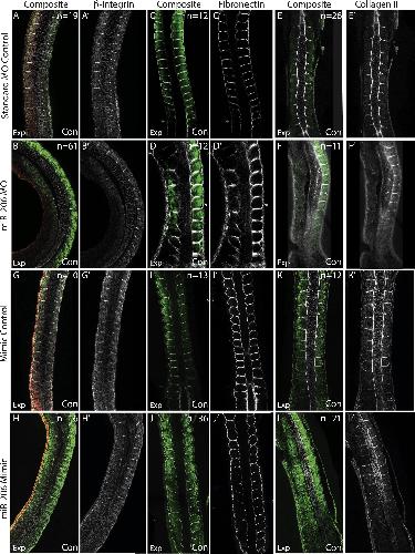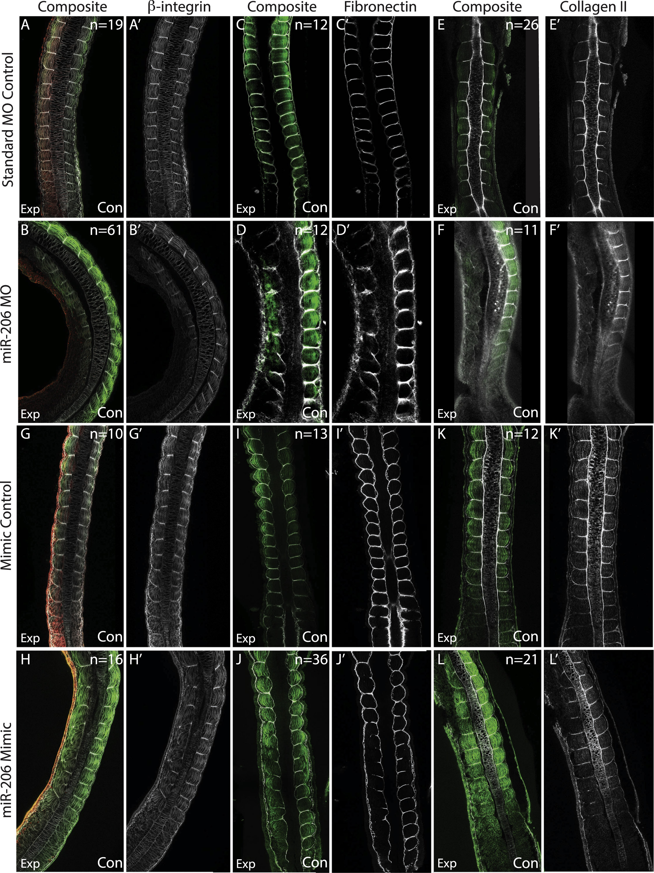 Fig. 8. Impact of miR-206 levels on the distribution of β-integrin, fibronectin and collagen II during somite morphogenesis. Distribution of β-integrin, fibronectin and collagen II in standard MO (A, C, E), miR-206 MO (B, D, F), mimic control (G, I, K), and miR-206 mimic (H, J, L) embryos injected at the two-cell stage. The injected side is always on the left side of the embryo. 12/101 expression is shown in green. Sample size is indicated. Magnification: 25 × .