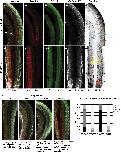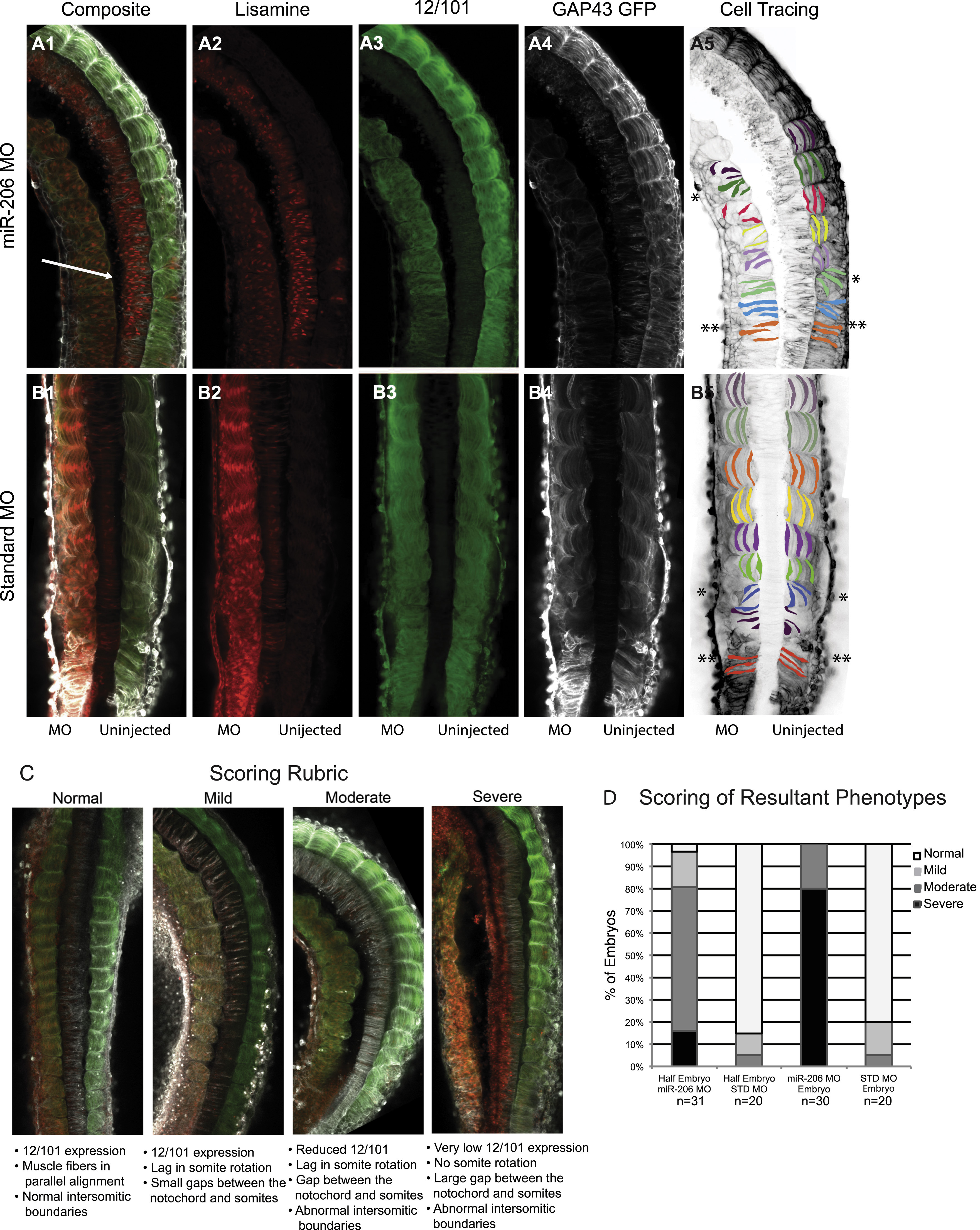 Fig. 4. Knockdown of miR-206 disrupts somite morphogenesis in X. laevis. Composite dorsal confocal images of stage 28 miR-206 (A) and standard (B) half-morphants showing the overall morphology of the paraxial mesoderm and surrounding tissues. A composite image shows the merged expression pattern of the lissamine-tagged MO (red), the muscle specific marker 12/101 (green), and the membrane-bound expression of GAP43 (white) in miR-206 (A1) and standard (B1) morphants The subsequent panels show each channel independently. The lissamine-tagged morpholino is restricted to the left side of the miR-206 (A2) and standard (B2) morphants. The muscle-specific marker, 12/101, shows muscle formation in both the miR-206 (A3) and standard (B3) morphant embryos. GAP43-GFP images were inverted and then pseudo-colored. The single asterisk represents the anterior-most somite undergoing rotation whereas the double asterisk represents the anterior-most region of the PSM. Magnification: 20 × . (C) Quantification of the miR-206 morphant phenotype. Morphant phenotypes were evaluated using a scaling rubric that spans from “Normal” to “Severe” phenotypes. The criteria for each score is described under each category and is based on various features including 12/101 expression levels, somite rotation, intersomitic boundaries and extracellular space between the notochord and somites. Embryos were first injected at the one cell stage with GAP43-GFP and then injected at the two-cell stage with miR-206 or standard MO. Between stages 26–28, embryos were stained with the muscle specific marker 12/101 and then scored using the described rubric. (D) A graph shows the percent of embryos that reflect phenotypes ranging from “Normal” to “Severe” for miR-206 MO-injected embryos and half embryos in comparison to standard MO-injected embryos.
