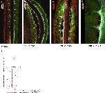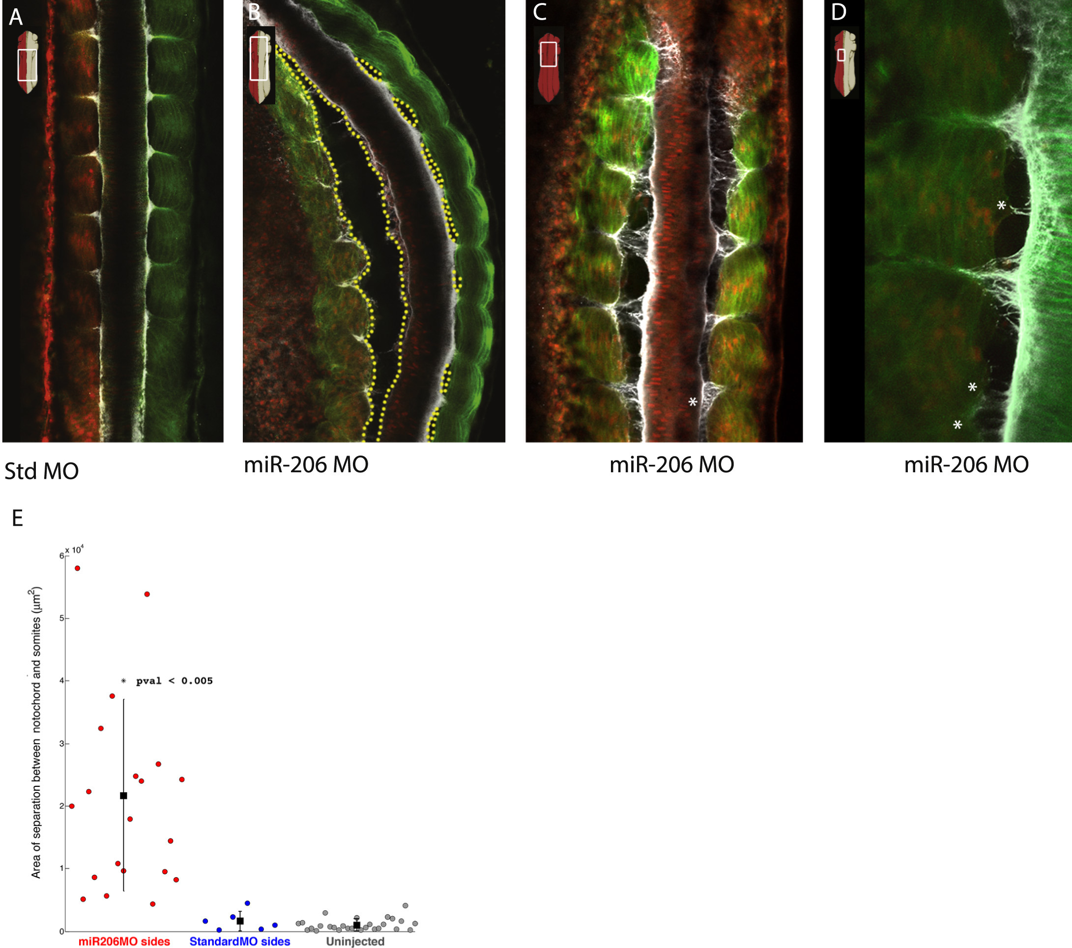 Fig. 5. Knockdown of miR-206 disrupts the adhesive interaction between the somites and the notochord. (A) Single-plane confocal image of standard-half morphant embryo stained for muscle (12/101) and notochord (Tor 70) illustrating the close juxtaposition between the notochord and the somites. (B) miR-206 half morphant embryo is detached from the notochord on the left side and Tor 70 expression is found in the intersomitic boundaries of the detached somites. (C) miR-206 MO injected at the one cell stage showing detachment of somites on both sides of the notochord. (D) Close-up of a miR-206 morphant somite showing the fine notochord sheath filaments (asterisks) indicating that adhesion to the notochord occurs throughout the medial edge of the somite with the highest concentration at the medial edge of the intersomitic boundary. (E) Graph showing the surface area (µm2) between the somites and notochord in miR-206 half morphants, standard half morphants, and the uninjected side of embryos between stages 24–26. An example of the surface area used in these measurements is highlighted by yellow dots around the notochord and somites shown in B. Significance is calculated using the Two-Sample T-test analysis, p < 0.005 for both comparisons.