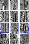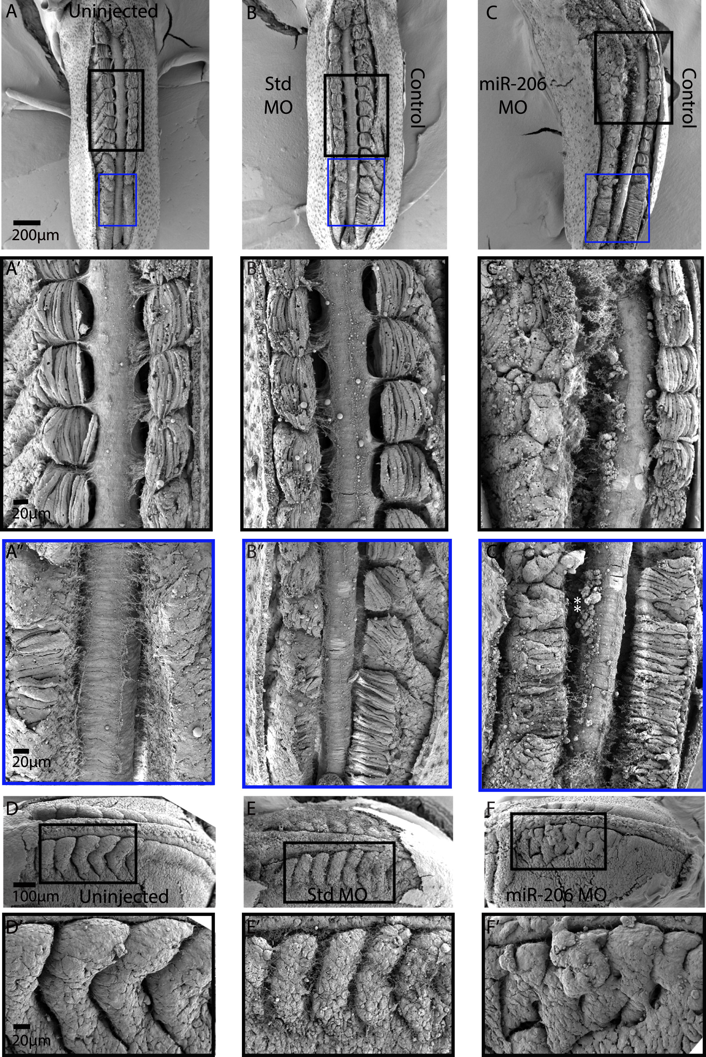 Fig. 6. Scanning electron microscopy shows that knockdown of miR-206 levels disrupts the overall somite architecture. Dorsal view of scanning electron micrograph (SEM) images of uninjected (A), standard (B) and miR-206 half morphant (C) embryos at stage 26. (A’-C’) Black box shows a close up of the mid-trunk region of the paraxial mesoderm. (A”-C”) Blue box provides a magnification of the PSM region. Asterisks in C” show the increasing separation of cells from the notochord as they begin to undergo rotation. (D-F) Dorso-lateral surface of embryos showing the neural tube and dorsal surface of the paraxial mesoderm of stage 24 embryos. (D’-F’) Black box shows a close-up view of the dorsal surface of somites.