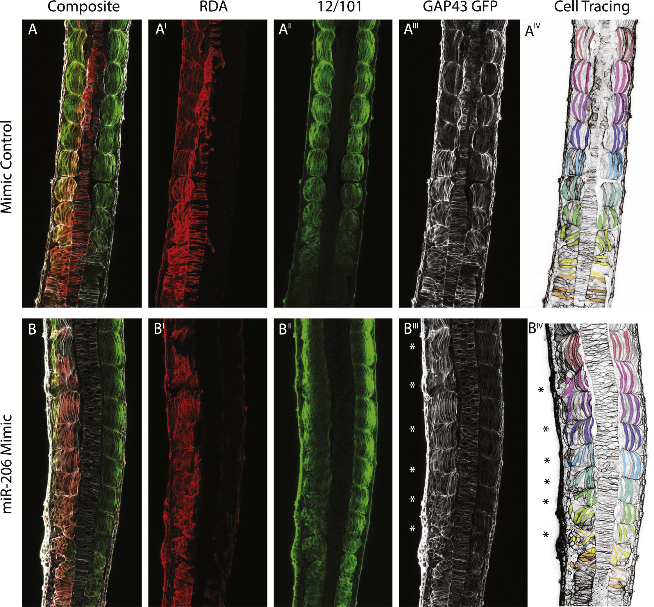 Fig. 7. Ectopic expression of miR-206 specifically disrupts somite morphogenesis. Composite image shows the merged expression pattern of stage 28 embryos injected at the one cell stage with GAP43 mRNA (white), and at the two-cell stage with 12 ng of either control (A) or miR-206 (B) duplex along with rhodamine dextran amine (RDA; red), a cell lineage tracer. Embryos were stained for muscle using 12/101 (green). Subsequent panels show each channel independently. RDA shows that the mimic is restricted to the left side in control (A’) and miR-206 (B’) mimic-injected embryos. Muscle-specific marker, 12/101, shows muscle formation in both control (A”) and miR-206 (B”) mimic-injected embryos. Cell shapes are highlighted by the expression of GAP43 GFP and images were inverted and pseudo-colored. (BIV) Asterisks highlight the irregularly-shaped cells at the lateral edge of many somites. Magnification: 20 × .