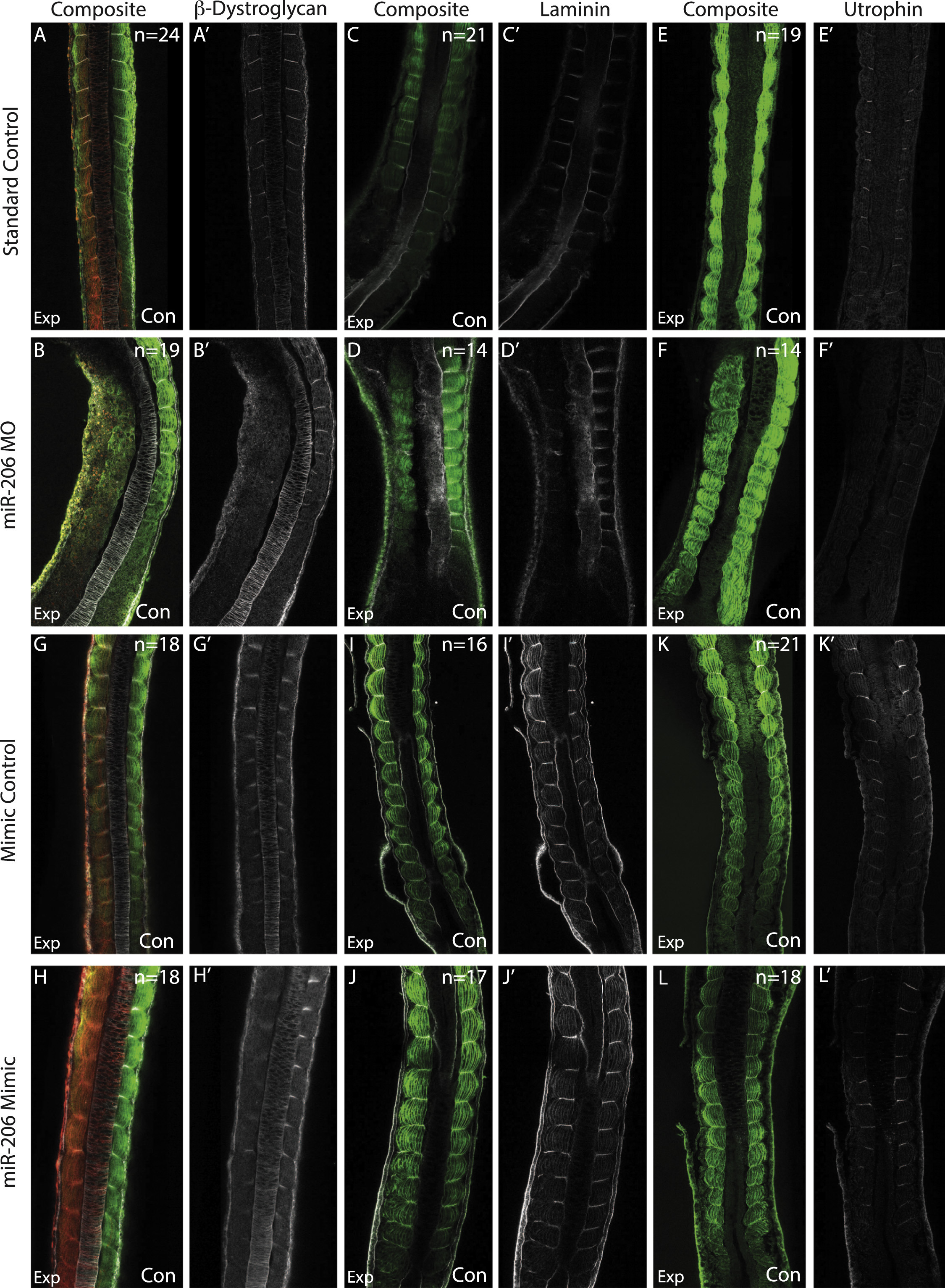 Fig. 9. Changes in miR-206 levels significantly affect the expression levels of β-dystrogylcan, laminin and utrophin. Distribution of β-dystrogylcan, laminin and utrophin levels in standard MO (A, C, E), miR-206 MO (B, D, F) mimic control (G, I, K), and miR-206 mimic (H, J, L) embryos injected at the two-cell stage. The injected side is always on the left side of the embryo.12/101 expression shown in green. Sample size is indicated. Magnification: 25X.