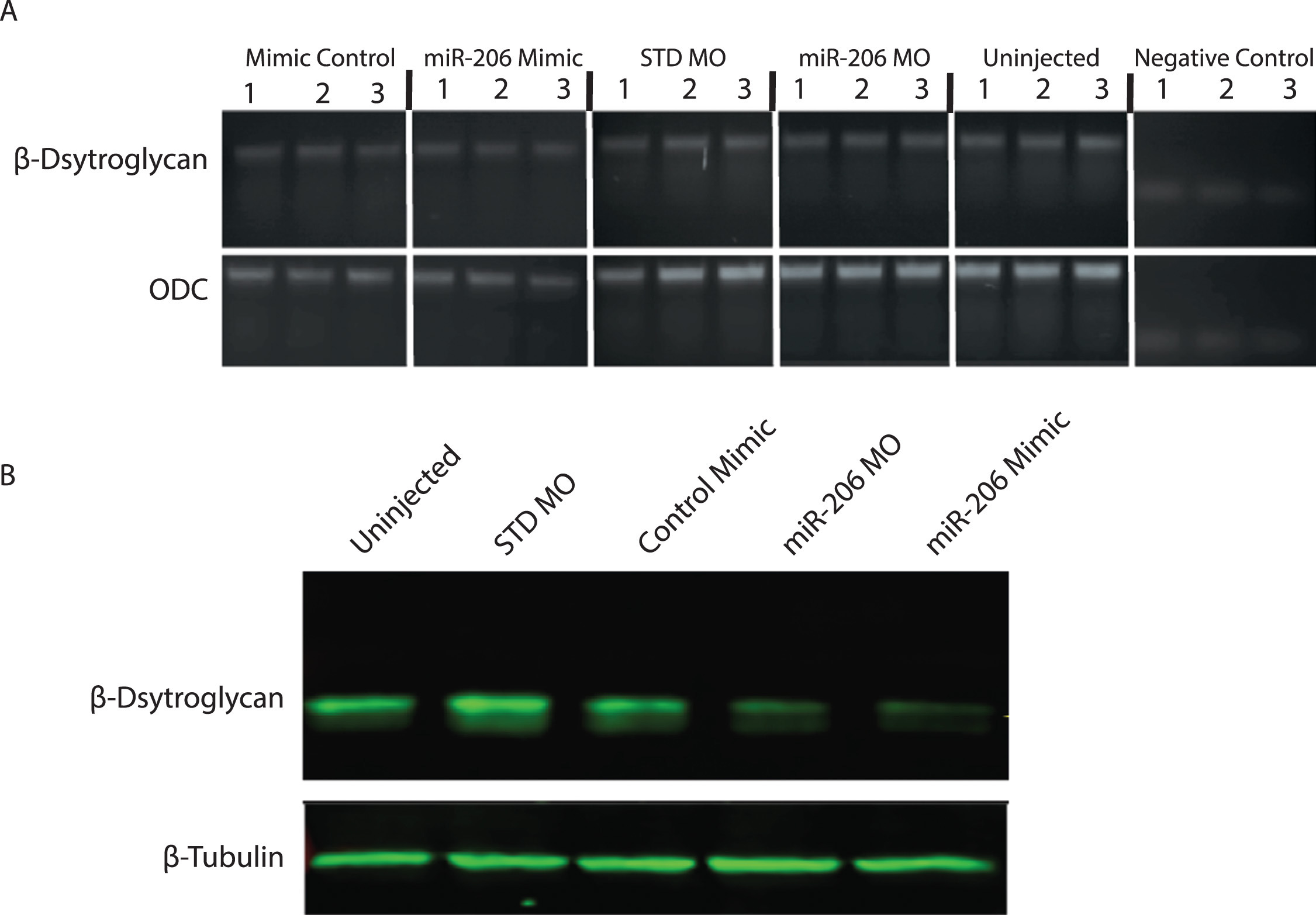 Fig. 10. Changes in miR-206 levels decrease β-dystroglycan protein levels. (A) Ethidium stained agarose gels of RT-PCR reactions. RT-PCR was performed on RNA extracted from three different samples consisting of uninjected and MO or mimic injected stage 28 embryos. mRNA levels of β-dystroglycan and Ornithine decarboxylase (ODC) were examined from three different experiments. No differences were detected between experimental and control samples. (B) Western blot analysis of β-dystroglycan from stage 28 embryos that were uninjected or injected with standard MO, control mimic, miR-206 MO, or miR-206 mimic. β-tubulin was used as a loading control. A significant decrease in β-dystroglycan protein levels is observed in both miR-206 morphant and mimic embryos in comparison to controls.