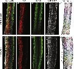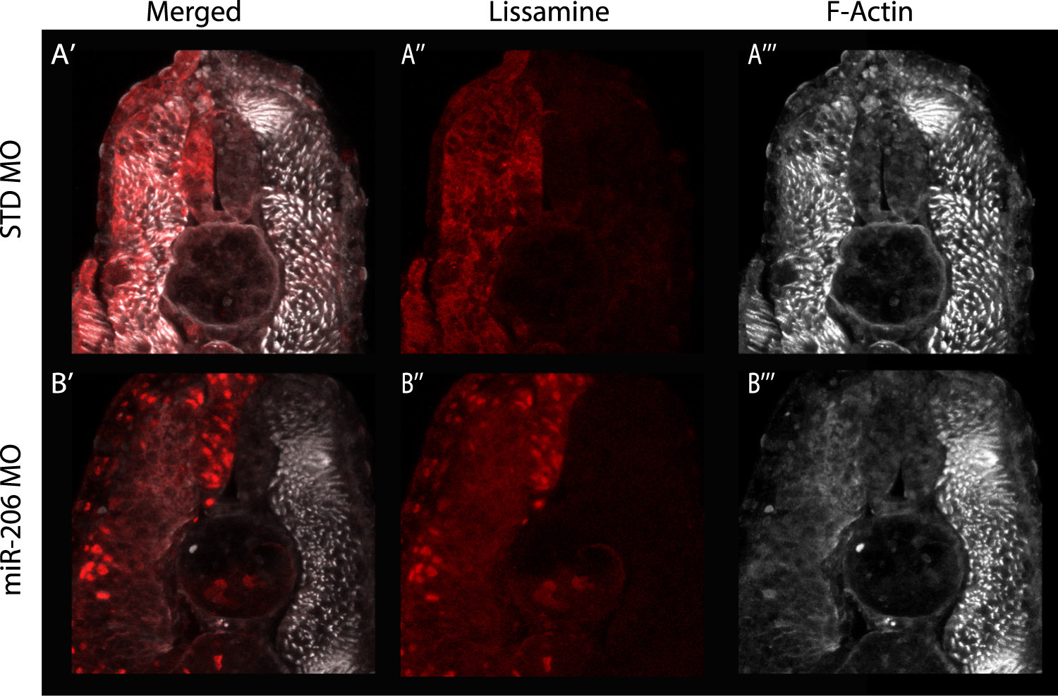 Fig. 11. Knockdown of miR-206 disrupts actin filament formation. Maximum projections of cross sections through the trunk region of miR-026 (A) and standard (B) morphant embryos stained with phalloidin. F-actin staining is significantly reduced on the miR-206 MO side (Bâ) in comparison to the contralateral side and to the standard MO embryo (Aâ). Magnification: 25X.