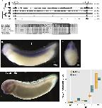 Fig. 1. Genomic architecture and expression analysis of miR-206 in Xenopus laevis. (A) Evolutionary conservation of miR-206/miR-133b cluster across various species. Top: Genomic sequence conservation landscape plot of miR-206/miR-133b cluster using the Homo sapiens genome as a reference. The immature sequences of both microRNAs are highlighted (grey). From top to bottom, species used to produce this multiple alignment are Mus musculus, Gallus gallus, Xenopus laevis, Xenopus tropicalis, and Danio rerio. On the right, the distance between the two microRNAs are indicated for each species. Bottom. Multiple sequence alignment of the immature miR-206 sequence for the species listed above. The box highlights the conserved mature miR-206 sequence. (B) Whole mount in situ hybridization analysis using a miR-206 probe (Exiqon) in X. laevis embryos at stage 32, lateral view, head to the left. A cross section at the level indicated by “B1” is shown to the right (B1). (C) Control in situ hybridization using DIG-labeled “scramble” probe (Exiqon). Magnification: 10 × . (D) Box plot showing the relative expression analysis of miR-206 and miR-133b across developmental stages using quantitative RT-PCR in uninjected embryos.