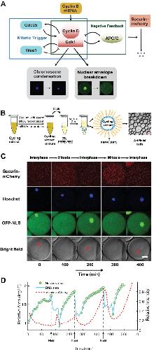 (A) Schematic view of a cell cycle oscillator that consists of coupled positive and negative feedback loops. The central regulator, cyclin B-Cdk1 complex activates its own activator, phosphatase Cdc25, forming a positive feedback loop, and inhibits its own inhibitor, kinase Wee1, forming a double negative feedback loop. Additionally, cyclinB-Cdk1 activates the E3 ubiquitin ligase APC/C, which targets cyclin B for degradation and completes a core negative feedback loop. Active APC/C also promotes the degradation of another substrate securin. Once cyclinB1-Cdk1 complex is activated, the circuit drives a set of mitotic events including chromosome condensation and nuclear envelope breakdown (NEB). (B) Experimental procedures. Cycling Xenopus extracts are supplemented with various combinations of recombinant proteins, mRNAs, and de-membraned sperm DNAs, which are encapsulated in 2% Perfluoropolyether-poly (ethylene glycol) (PFPE-PEG) oil microemulsions. Scale bar is 100 µm. (C) Snapshots of a droplet were taken periodically both in fluorescence channels (top three rows) and bright-field (the last row). The cyclic progression of the cell cycle clock and its downstream mitotic processes are simultaneously tracked by multiple fluorescence reporters. The clock regulator APC/C activity is reported by its substrate securin-mCherry, chromosomal morphology changes by the Hoechst stains, and NEB by GFP-NLS. Nuclear envelopes (red arrows) are also detectable on bright field images, matching the localization of GFP-NLS indicated nuclei. Scale bar is 30 µm. (D) Multi-channel measurements for the droplet in Figure 1C. The nucleus area (green circle) is calculated from the area of the nuclear envelope indicated by GFP-NLS, noting that the areas of the green circles are also scaled with the real areas calculated for the nuclei. DNA area curve (blue line) shows the chromosome area identified by Hoechst 33342 dye. Chromosome condensation happens almost at the same time as the nuclear envelope breaks down (black dashed line). The red dashed line represents the intensity of securin-mCherry over time, suggesting that degradation of the APC/C substrate lags behind NEB consistently at each cycle.