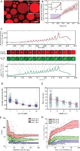 (A) Fluorescence image of securin-mCherry, a reporter for the cell cycle oscillator, in micro-emulsion droplets (scale bar, 100 µm). One example droplet (inside the white dotted framed square) is selected for time course analysis in Figure 2B. (B) The time course of securin-mCherry fluorescence intensity of the selected droplet from Figure 2A, indicating 32 undamped oscillations over a course of 100 hr. (C) Simultaneous measurements of fluorescence intensities of securin-mCherry (upper panel) and cyclin B-YFP (lower panel), showing sustained oscillations for about 58 hr. The mRNA concentrations of securin-mCherry and cyclin B-YFP are 10 ng/µL and 1 ng/µL. The series of mCherry and YFP images correspond to selected peaks and troughs in the time courses of fluorescence intensities. The two channels have coincident peaks and troughs for all cycles, suggesting that they both are reliable reporters for the cell cycle oscillator. (D, E) The oscillator is tunable in frequency (D) and number of cycles (E) as a function of the concentration of cyclin B mRNAs. Cyclin B not only functions as a substrate of APC/C but also binds to Cdk1 for its activation, functioning as an ‘input’ of the clock. In Figure 2D, the cell cycle periods are shortened by increasing the mRNA concentrations. In Figure 2E, the number of total cell cycles is reduced in response to increasing cyclin B mRNA concentrations. Each data point represents a single droplet that was collected from one of the loading replicates (see Materials and methods 7). Red dashed line connects medians at different conditions. Error bar indicates median absolute deviation (MAD). (F, G) Droplets with smaller diameters have larger periods on average and a wider distribution of periods (F), and exhibit smaller number of oscillations on average (G). Colored areas represent moving 25 percentiles to 75 percentiles and is smoothed using the LOWESS smoothing method (see Materials and methods 7). The equivalent diameter is defined as the diameter of a sphere that has an equal volume to that of a droplet, estimated by a volume formula in literature (Good et al., 2013). Note that these size effects are smaller for droplets with higher cyclin B mRNA concentrations.