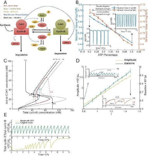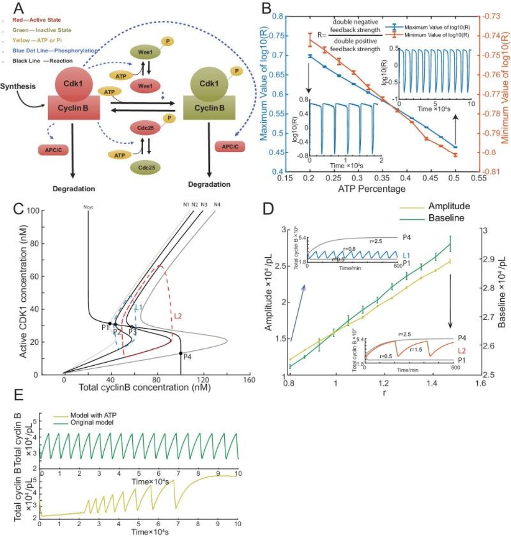 (A) Schematic view of the cyclin B-Cdk1 oscillation system. Note that ATP is taken into consideration. Activated molecules are marked in red, inactivated molecules in green and ATP or Pi in yellow. Black line indicates a reaction and blue dotted line a phosphorylation. (B) Relationship between ATP percentage and R value, showing that decreasing the ATP concentration leads to a higher R value. Error bars represent ranges from three simulations. Two inserts represent the dynamics of R value over time when the ATP percentage [ATP]/([ATP]+[ADP]) is set as 0.2 (left) and 0.5 (right). The model is simulated using Gillespie algorithm. (C) Phase plots of the two-ODE model. Parameters for the cyclin B nullcline (Ncyc) (Yang and Ferrell, 2013) and the Cdk1 nullclines with a variety of values of r (N1, r = 0.5; N2, r = 0.8; N3, r = 1.5; N4, r = 2.5) were chosen based on previous experimental work (Pomerening et al., 2003; Sha et al., 2003). Note that the r here is a parameter and is different from R in Figure 3B. Two sample traces of limit cycle oscillations are plotted for r = 0.8 (L1) and r = 1.5 (L2), showing that a larger r value leads to a higher amplitude and baseline. In addition, r = 0.5 (N1) generates a low stable steady-state of cyclin B (P1), while r = 2.5 (N4) a high stable steady-state of cyclin B (P4). These stable steady-states are indicated by the intersections of the nullclines (filled circles). The unstable steady states are labeled with open circles (P2 and P3). (D) Relationship between the oscillation baseline and amplitude values and ATP concentration (positively correlated with r). Error bars indicate the ranges of 3 replicates. Inserts show two example time courses of total cyclin B with different r values (L1, r = 0.8; L2, r = 1.5), colors of which match the ones in Figure 3C. Simulation is done using Gillespie algorithm. (E) Time series of total cyclin B molecules from the model without ATP (top panel, green line) and with ATP (bottom panel, yellow line).