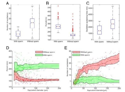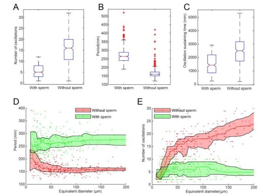Author response image 1. A-C Statistics of droplets with sperm DNA (N=320) and without sperm DNA (N=373).All droplets were prepared in the same day from the same batch of frog eggs. The figures show that adding sperm DNA may cause significant difference in number of oscillations (A), period (B) and oscillation sustaining time (C). D-E. Droplet-size dependence of period (D) and number of oscillations (E) with nucleus effect, showing that adding sperm DNAs has a more significant impact on larger droplets.