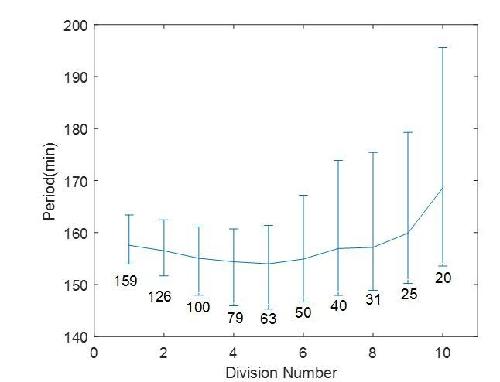 Author response image 2. A thought experiment of a droplet of 200 µm in diameter undergoing ten divisions.The cell cycle period is calculated for each division, with each corresponding diameter labeled on the figure. The error bar is showing 25th and 75th percentile as in Figure 2F in the main text.