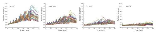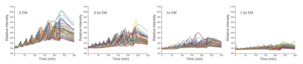 Author response image 6. Time traces of individual droplets with different concentrations of energy mix.Each condition has two duplicate experiments and only one is shown. It is evident that the amplitude, baseline, and period decrease as the level of energy mix increases.