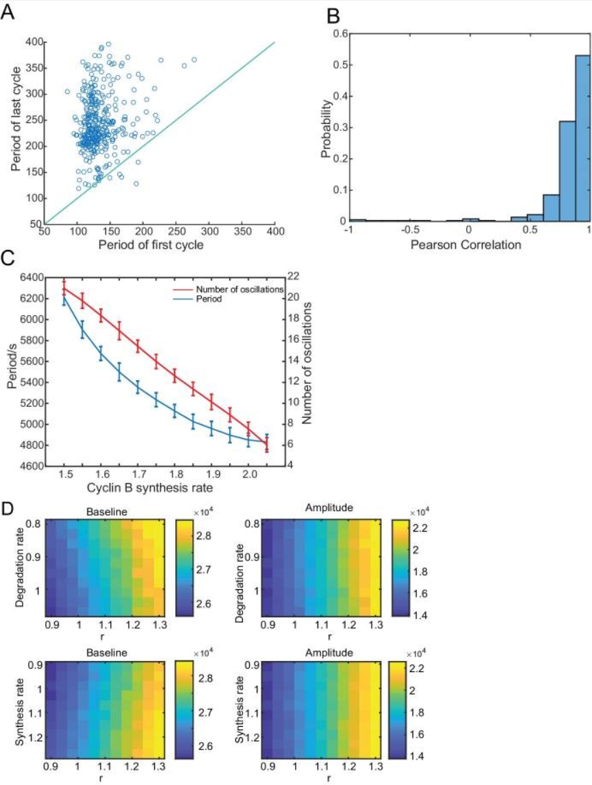 (A) The period of the first cycle vs the last cycle in a droplet, showing that the period of the last cycle tends to be longer. Blue line indicates the same first and last periods. (B) Pearson correlation between the period of cycle and the index of cycle in a droplet. Positive correlation indicates that the cell cycle period tends to increase over time. (C) The period and number of oscillations decrease with an increasing cyclin B synthesis rate. Error bars represent standard deviations from 50 simulations. (D) Effects of synthesis and degradation rates of cyclin B as well as r on the baseline and amplitude of oscillations of total cyclin B. Color bar indicates baseline or amplitude of cyclin B (number of molecules per pL).