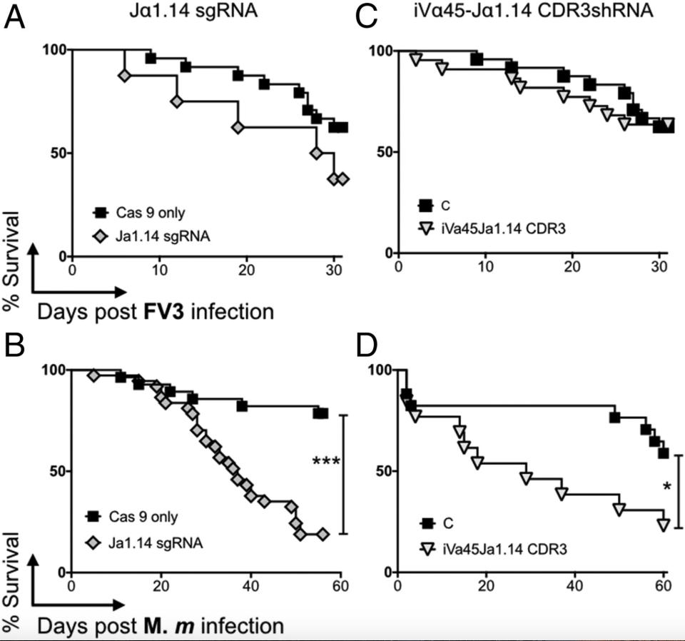 iVα45 T cells are required for host resistance to Mm but not FV3 infection. F0 transgenic iVα45-Jα1.14 CDR3 KD and control tadpoles (stage 52/53) were sham infected (controls) or either i.p. infected with 1 × 104 pfu FV3 (A and C) or 300,000 cfu Mm (B and D), and survival was monitored daily over a 30- and 60-d period, respectively. Each experiment was repeated three times independently (n = 15 in each cohort) and the results were pooled. Survival was determined using Kaplan–Meier, *P < 0.05, ***P < 0.0005. Shown are dejellied controls (black squares), iVα45-Jα1.14 CDR3shRNA Tg (inverted gray triangles), and Jα1.14sgRNA/CRISPR Tg (gray diamonds).