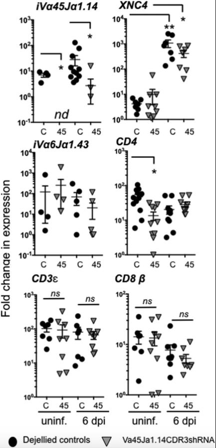 iVα45-Jα1.14 CDR3shRNA KD specifically ablates iVα45 T cells. Quantitative gene expression analysis of iVα45-Jα1.14, iVα6-Jα143, CD3ε, CD4, CD8β, and XNC4 in liver isolated from either uninfected (unif.) or Mm (300,000 cfu) infected F0 transgenic tadpoles KD for Vα45Jα1.14 CDR3 (gray triangles, n = 10) or age-matched dejellied control (black circles, n = 10) at 0 and 6 dpi. Gene expression was determined relative to the endogenous control GAPDH and normalized against respective uninfected gene expression. Results are representative of two independent experiments and presented with the mean ± SEM (n = 10â12). *P < 0.05, **P < 0.005, (one-way ANOVA test followed by a post hoc analysis using Tukeyâs multiple comparisons test). ns, nonsignificant.