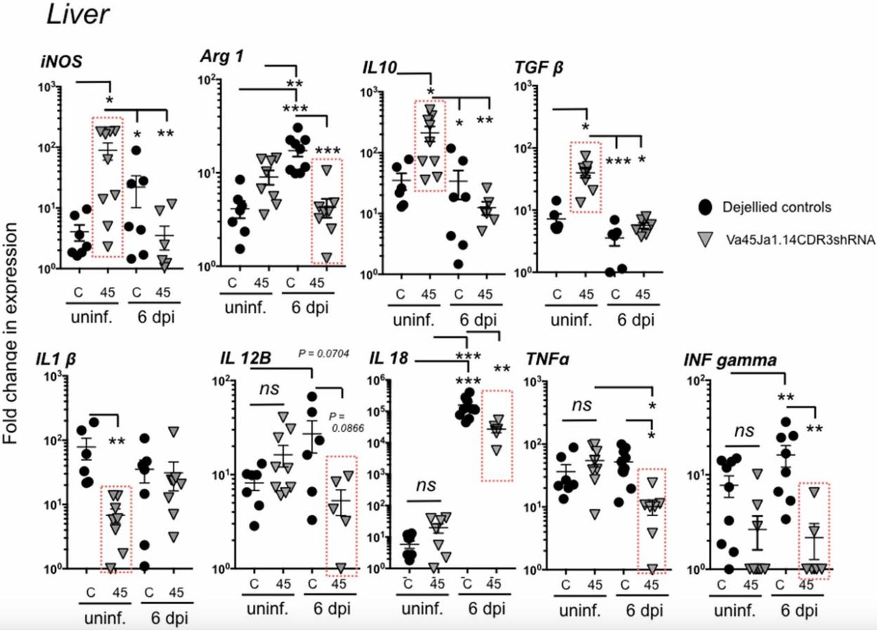 iVα45 T cell deficiency impacts cytokine expression profile in liver of Mm-infected tadpoles. Relative gene expression analysis by qPCR for inducible nitric oxide (iNOS), Arginase 1 (Arg1), interleukin 10 (IL-10), transforming growth factor β (TGFβ), interleukin 1β (IL1β), interleukin 12 (IL12-B), interleukin 18 (IL-18), tumor necrosis factor α (TNFα), and interferon gamma (IFN-γ) in liver isolated from either uninfected or Mm (300,000 cfu)-infected F0 transgenic tadpoles with KD of Vα45Jα1.14 CDR3 (gray triangles, n = 10) or age-matched dejellied control (black circles, n = 10) at 0 and 6 dpi. Gene expression was determined relative to the endogenous control GAPDH and normalized against respective uninfected gene expression. Results are representative of two independent experiments and presented with the mean ± SEM (n = 10â12). *P < 0.05, **P < 0.005, ***P < 0.0005 (one-way ANOVA test followed by a post hoc analysis using Tukeyâs multiple comparisons test). ns, nonsignificant.