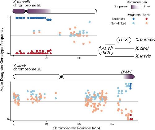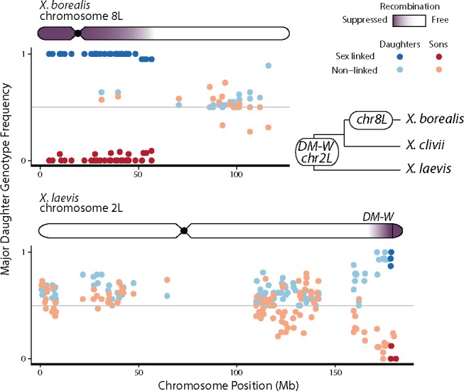 —Sex-linkage of SNPs on sex chromosomes of X. borealis and X. laevis. In each graph, the x-axis is the position on the sex chromosome using the coordinates of the X. laevis reference genome and the y-axis is the major daughter genotype frequency in sons and daughters (see Materials and Methods for details) with colors as defined in the key indicating whether or not a SNP is significantly associated with sex (FDR corrected P < 0.05). For each species, a diagram of a chromosome is shaded darker in the region of suppressed recombination. The inset phylogeny is from Furman and Evans (2016); DM-W is carried by female X. clivii, but its presence on chr2L has not been confirmed.
