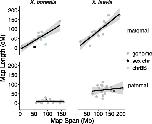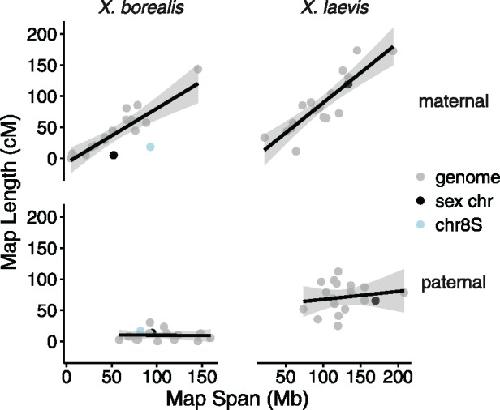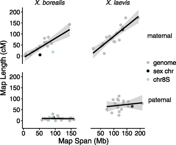 —Linkage map length (in cM) is positively correlated with the number of bp spanned by the map (based on the X. laevis genome) for maternal but not paternal linkage maps. Black “sex chr” dots indicate the linkage map of the sex chromosome of each species (chromosome 8 L in X. borealis, chromosome 2 L in X. laevis). Lines reflect linear model relationships; gray shading indicates the 95% confidence interval of this relationship. Additionally, chromosome 8S is highlighted for X. borealis, because it is the homeolog of the sex chromosome 8 L (see Results for details).