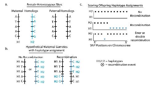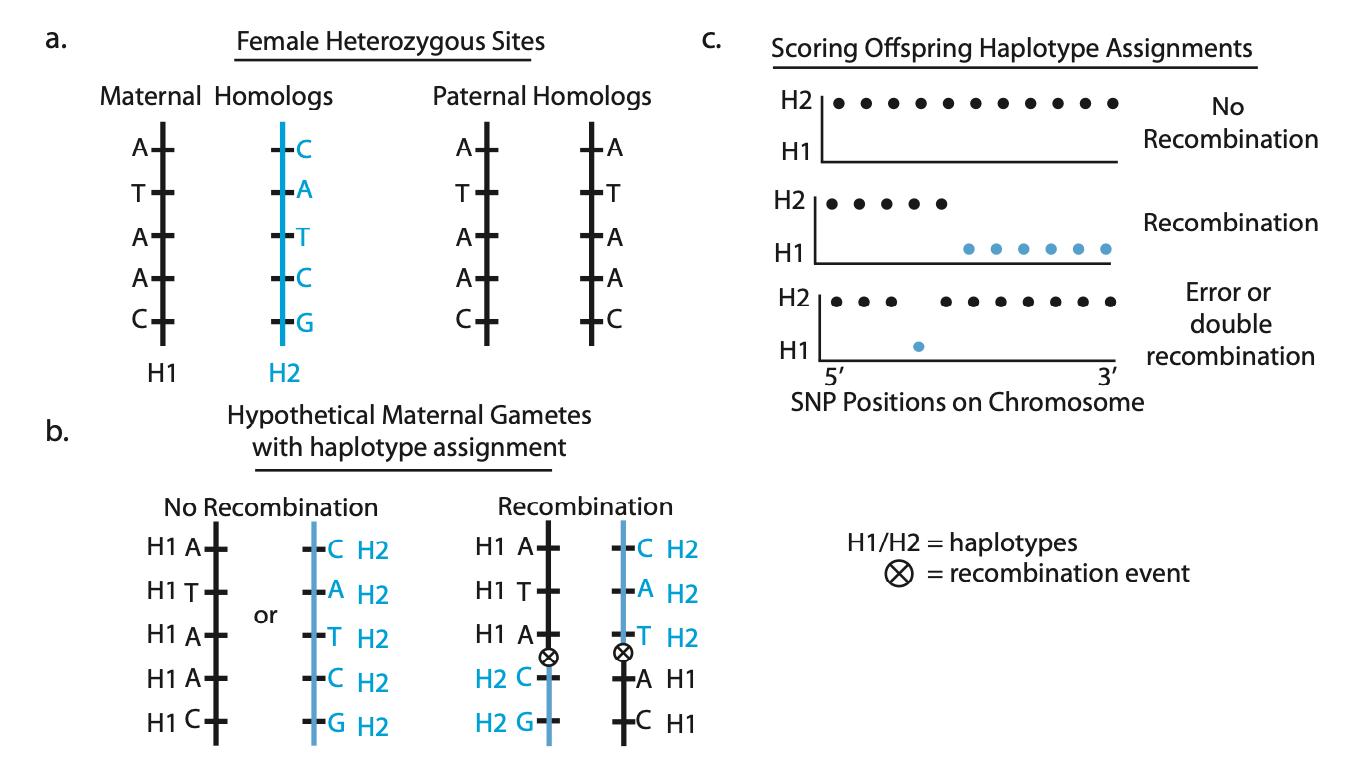 FIG. S1.—Using sex-specific linkage maps that were generated from sets of either female or male heterozygous sites, we determined (a) parental haplotypes. (b) A haplotype from each parent could either be inherited entirely (if no recombination happened in the genotyped region), or recombined. (c) Scoring offspring haplotypes for sex specific maps of each chromosome allows for visualization and counting of the number of recombination events and identification of genotyping errors or improbable double recombination events.