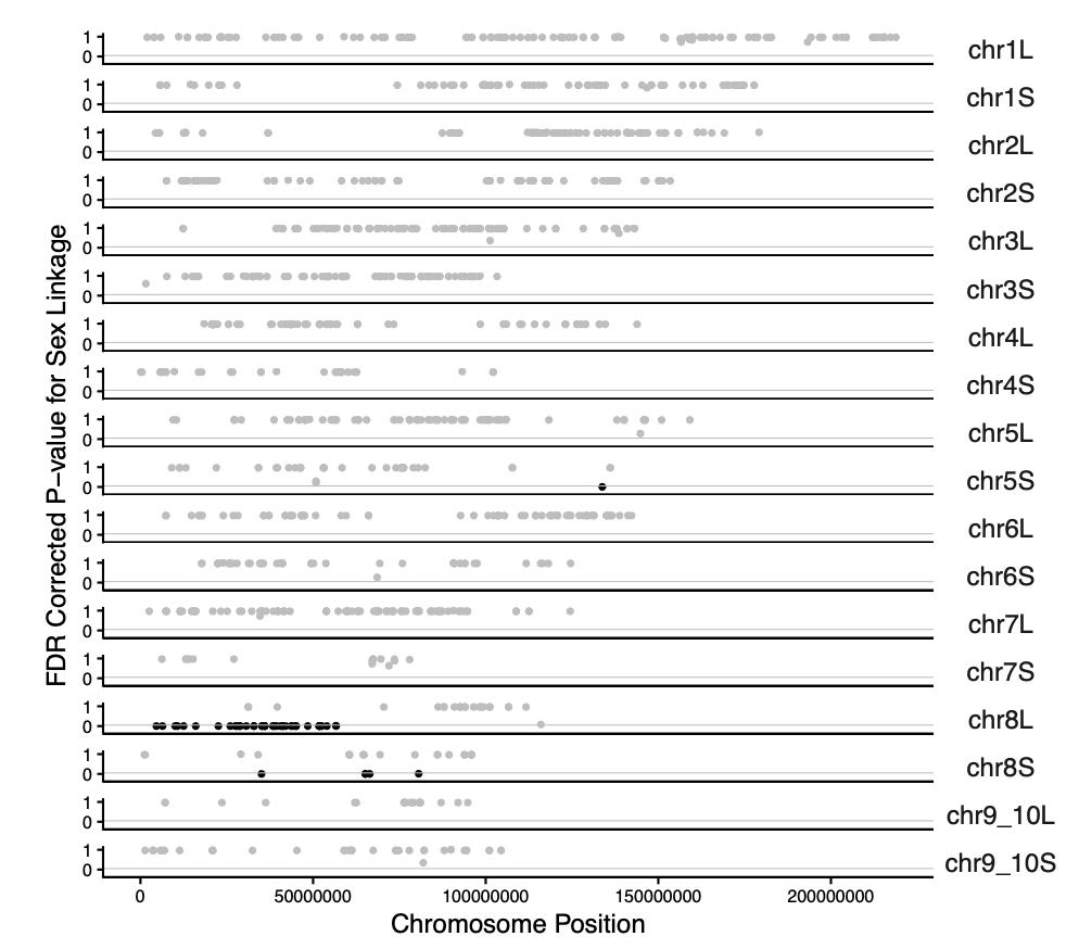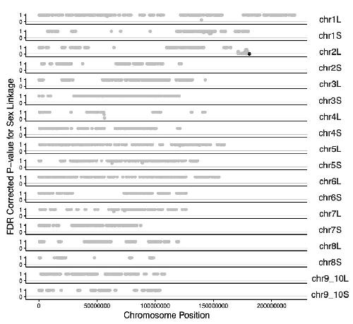 FIG. S2.—SNPs from the X. borealis family heterozygous in the mother mapped to the genome of X. laevis. Sex-linkage is calculated following Goudet et al. (1996), followed by an FDR correction to account for multiple testing (significant genotypes are indicated by black dots). The gray lines in each plot represent the significance threshold of 0.05. The sex-linked marker on chr5S can be mapped to chromosome 8S and 8L when a larger amount of sequence data is used (see Results).