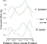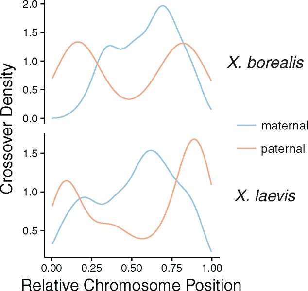 —Density plots of recombination events with respect to the relative position along chromosomes (chromosome length scaled to be between 0 and 1) in the maternal and paternal linkage maps of X. borealis and X. laevis.