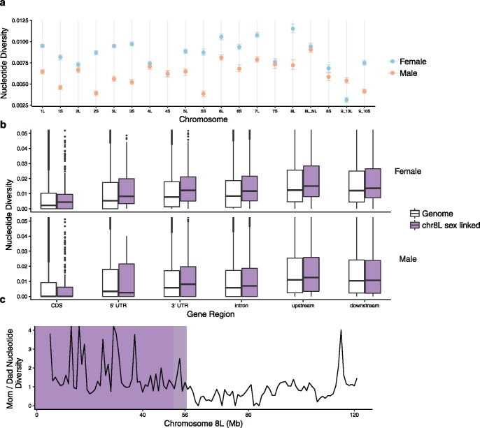 —Nucleotide diversity (π) in X. borealis based on WGS data mapped to the X. laevis reference genome. (a) Median π by chromosome as measured in the six genomic categories; error bars indicate 95% CI bootstrap estimates (for further information on differences see supplementary S1.4, Supplementary Material online). The 8 L_NL category refers to the diversity measured on chromosome 8 L in the nonsex-linked region (57–120 Mb). (b) Box and whisker plot of π across six genomic categories (described in Materials and Methods); the y-axis is truncated at 0.05 for clarity. (c) Standardized nucleotide diversity of the female divided by the standardized nucleotide diversity of male in 1-Mb windows across chr8L; the completely sex-linked region is highlighted in dark purple, and the significantly sex linked region with suppressed recombination in light purple (see fig. 1).