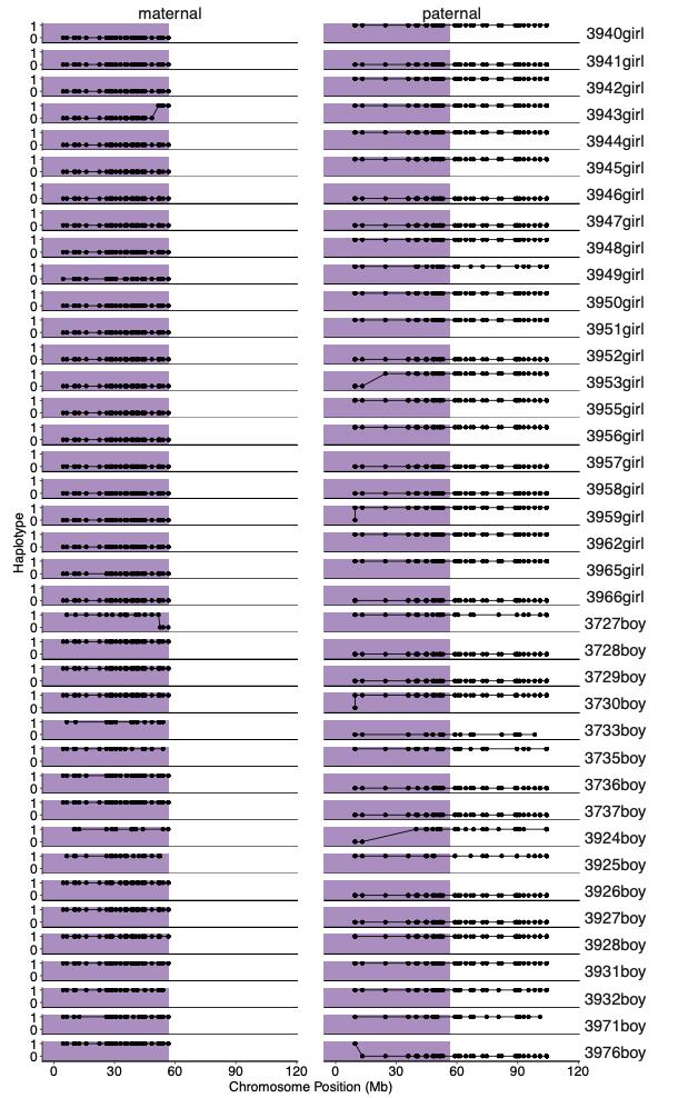 FIG. S3.—Phased parental haplotypes in X. borealis offspring for the maternal (left column) and paternal (right column) linkage groups of chromosome 8L. In the maternal haplotypes, the beginning of chromosome 8L is completely linked to sex (all daughters with the same haplotype, 0, and all sons had haplotype 1), apart from two recombination events near the end. Note, this linkage map only spans the sex- linked region (see Methods). For the paternal map, haplotypes are evenly shared between the sexes, indicating non-sex-linked inheritance of the paternal Z chromosome. In the region of the paternal Z chromosomes that is homologous to the sex-linked region of the maternal sex chromosomes, several recombination events are observed.