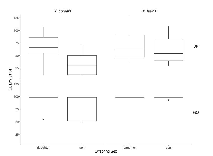 FIG. S4.—Median depth (DP) and genotype quality (GQ) for offspring of the X. borealis and X. laevis families for maternal heterozygous sites used in the sex linkage analysis of Fig. 1.