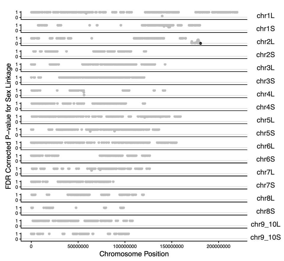 FIG. S5.—SNPs from the X.laevis family heterozygous in the mother mapped to the genome of X.laevis. Sex-linkage is calculated following Goudet et al. (1996), followed by an FDR correction to account for multiple testing (significant at 0.05 colored black). The gray lines in each plot represent the significance threshold of 0.05.