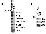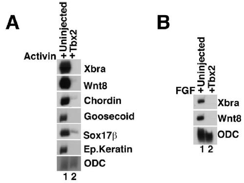 Fig. 2. Ectopic Tbx2 suppresses mesendoderm induction. A: Tbx2 inhibits Activin-induced mesendoderm. RT-PCR analysis of animal cap explants dissected at late blastula stages and cultured until midgastrula stages. Activin (0.25 ng/ml) was added to stage 8 animal caps excised from uninjected embryos or from embryos injected with tbx2 RNA into the animal pole of both blastomeres at the two-cell stage. B: Inhibition of FGF-mediated mesoderm induction by Tbx2. RT-PCR analysis of animal cap explants dissected at late blastula stages and cultured until midgastrula stages. Basic FGF (10 ng/ml) was added to stage 8 animal caps excised from uninjected embryos or from embryos injected with tbx2 RNA, as listed. Unless otherwise noted, 1 ng of tbx2 RNA was used in this and in subsequent experiments. |