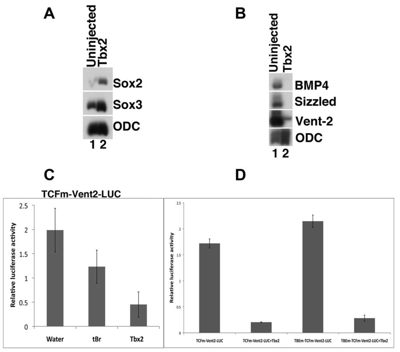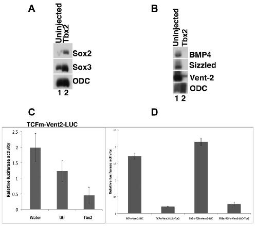 Fig. 3. Tbx2 promotes neural fate. A: Ectopic tbx2 induces the preneural markers sox2 and sox3. RT-PCR analysis was performed on animal cap explants from uninjected embryos and from embryos injected with tbx2 RNA; explants were harvested at gastrula stages. B: Tbx2 represses the BMP targets bmp4, sizzled, and vent-2 (Lee et al., 2002; Collavin and Kirschner, 2003). RT-PCR analysis of mid-gastrula stage animal caps. C: Tbx2 misexpression inhibits expression of a Vent-2 luciferase reporter fusion protein (TCFm-Vent2-LUC); this construct includes a mutation in a TCF binding site that renders it insensitive to Wnt activation (Hikasa et al., 2010). Truncated BMP receptor (tBR) was used a positive control (Graff et al., 1994). Embryos at the two-cell stage were injected with 5 pg of pRLTK, 50 pg of TCF and 1 ng tbx2 RNA or 1 ng tBR RNA in the animal pole. D: Tbx2 misexpression inhibits expression of a Vent-2 luciferase reporter fusion protein with a mutation in the putative T-box binding element (TBEm-TCFm-Vent2-LUC). TCFm-Vent2-LUC and TBEm-TCFm-Vent2-LUC were injected in the absence or presence of tbx2 RNA at the two-cell stage and collected for analysis of Luciferase expression. Samples of five whole embryo lysates were assayed in triplicate for Firefly and Renilla luciferase activity at mid-gastrula stages. Fifteen embryos were used for each trial, and each experiment was repeated at least 3 times to confirm the observed trends. Error bars indicate standard error. |
