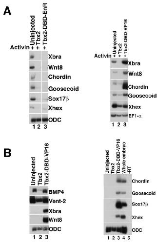Fig. 6. Tbx2 functions as a repressor during germ layer differentiation. A: Expression of Tbx2-DBD-EnR inhibits mesendoderm induction by Activin (left panel); expression of Tbx2-DBD-Vp16 does not inhibit Activin-mediated mesendoderm induction (right panel). RT-PCR analysis of animal caps dissected at late blastula stages and cultured until midgastrula stages. tbx2-DBD-EnR or tbx2 DBD-VP16 RNA (1 ng) was injected at early cleavage stages, as indicated. Activin (0.5 ng/ml) was added to stage 8 animal caps, as indicated. B: Expression of Tbx2 DBDVP16 fails to inhibit BMP target gene expression (left panel), and stimulates expression of mesodermal and endodermal marker genes in the absence of exogenous growth factors (left and right panels). RT-PCR analysis of animal caps dissected at late blastula stages and cultured until mid-gastrula stages. tbx2-DBD-VP16 RNA (1 ng) was injected at early cleavage stages, as indicated. The “-RT” lane contains all reagents except reverse transcriptase and was used as a negative control. |
