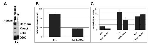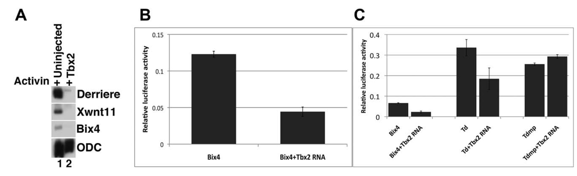 Fig. 7. Tbx2 represses downstream targets of VegT and Brachyury. A: Tbx2 represses expression of derriere, xwnt11, and bix4 (Zhang and King, 1996; Casey et al., 1999). RT-PCR analysis of animal caps dissected at late blastula stages and cultured until mid-gastrula stages, as indicated. Activin (0.5 ng/ml) was added to stage 8 animal caps, as indicated. B: tbx2 represses expression of a Bix4 reporter construct. Embryos at the two-cell stage were injected with bix4-LUC (20 pg) and pRLTK (7 pg), in the absence and presence of tbx2 RNA (250 pg). Whole embryo lysates from gastrula stage embryos were assayed in triplicate for Firefly and Renilla luciferase activity. C: Mutation of three T-box binding sites renders bix4 insensitive to repression by Tbx2. Embryos were injected at the two-cell stage with pRLTK (7 pg) and bix4-LUC (20 pg), Td-LUC (20 pg), or Tdmp-LUC (20 pg) in the absence and presence of tbx2 RNA. Tbx2 blocks the expression of Td-LUC less efficiently than it does bix4-LUC, while mutation of the three T-box sites renders Tdmp-LUC insensitive to repression by Tbx2. Samples of five whole embryo lysates from gastrula stage embryos were assayed in triplicate for Firefly and Renilla luciferase activity. Error bars indicate standard error. |