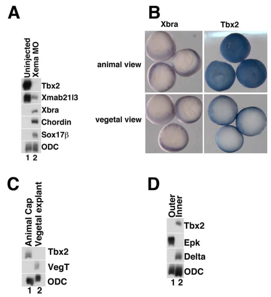 Fig. 1. tbx2 expression in the blastula and gastrula stage ectoderm is dependent on Xema/Foxi1e activity. A: Xema morpholino-mediated knockdown (Xema MO) inhibits expression of tbx2. RT-PCR analysis of early gastrula stage explants. Ornithine decarboxylase (ODC) was used as a loading control (Bassez et al., 1990). B: Whole-mount in situ hybridization of early gastrula stage embryos (stage 10.5). Tbx2 expression is seen as a blue stain throughout the animal pole of albino embryos; tbx2 expression is excluded from the vegetal pole. Expression of the panmesodermal marker Xbra is only detected in the marginal zone of gastrula stage embryos, as expected (Smith et al., 1991). C: RT-PCR analysis of tbx2 in late blastula stage explants. tbx2 is expressed in the animal cap and excluded from vegetal pole explants; vegt is only expressed in vegetal explants, as expected (Lustig et al., 1996; Stennard et al., 1996; Zhang and King, 1996; Horb and Thomsen, 1997). D: Inner and outer layers of early gastrula stage ectoderm were separated and analyzed by RT-PCR for expression of tbx2. tbx2 is expressed in the inner layer of the ectoderm; delta is only expressed in the inner layer, and epidermal keratin is only expressed in the outer layer (Jonas et al., 1985; Chalmers et al., 2002). All experiments shown or described in this figure, and throughout the manuscript, were performed at least three times. |