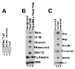 Fig. 4. Tbx2 knockdown leads to ectopic expression of mesendodermal marker genes. A: Tbx2 morpholino (Tbx2MO) blocks translation of tbx2 RNA in vitro. MObs-Tbx2 is a tbx2 construct that contains the Tbx2MO-binding site. B: Mesendodermal markers are up-regulated in ectodermal explants derived from Tbx2 morpholino-injected embryos. RT-PCR analysis of animal cap explants dissected at late blastula stages and harvested at mid-gastrula stages; embryos were injected with Tbx2 morpholino (80 ng) at early cleavage stages. For the rescue experiment, 80 ng of Tbx2 morpholino and 1 ng of tbx2 RNA were coinjected at early cleavage stages. C: Injection of a control (80 ng), “scrambled” morpholino does not lead to extra-ectodermal gene expression, while injection of Tbx2 morpholino (80 ng) results in ectopic expression of both mesodermal and endodermal markers. |