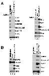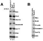Fig. 5. The Tbx2 C-terminus is required for mesendoderm suppression. A: Expression of Tbx2DC does not suppress mesoderm induction by Activin. RT-PCR analysis of animal caps dissected at late blastula stages and cultured until mid-gastrula stages. tbx2DC RNA (1 ng) was injected at early cleavage stages, as indicated. Activin (0.5 ng/ml) was added to stage 8 animal caps, as indicated. B: Expression of Tbx2DC stimulates expression of mesodermal marker genes in the absence of exogenous growth factors. RT-PCR analysis of animal caps dissected at late blastula stages and cultured until mid-gastrula stages. tbx2DC (1 ng) was injected at early cleavage stages, as indicated. |