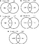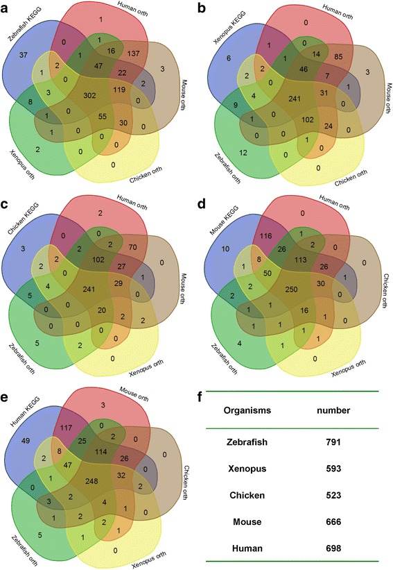 Fig. 1. Carbohydrate/glucose metabolic genes in Danio rerio (zebrafish), Xenopus tropicalis (frog), Gallus gallus (chicken), Mus musculus (mouse) and Homo sapiens (human). These diagrams are modified from VENNY (see Methods). Numbers in the overlapping and non-overlapping areas of the diagram indicate the number of genes found by overlapping or unique sets of orthologues and KEGG genes in each species. a Venn diagram of 791 zebrafish carbohydrate/glucose metabolic genes, which are merged with 545 zebrafish KEGG database genes and human (676), mouse (637), chicken (418) and frog (352) KEGG resource gene orthologues. b Venn diagram of 593 frog carbohydrate/glucose metabolic genes, which are merged with 352 frog KEGG database genes and human (676), mouse (637), chicken (418) and zebrafish (545) KEGG resource gene orthologues. c-e Similar to the data mining in zebrafish and frog, there are 523, 666 and 698 carbohydrate/glucose genes in chicken, mouse and human, respectively. f The table gives an overall measure of how many genes were found in each organism. The gene list can be seen in Additional file 1: Table S1