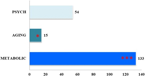 Fig. 2. Disease annotation of 698 human carbohydrate/glucose metabolic genes using DAVID. The chart displays part of the significant enrichment analysis of disease in human carbohydrate/glucose metabolic gene database. The x-axis shows the gene number involved in the annotation terms. The y-axis represents the disease terms. One star denotes P < 0.05, whereas three stars denote P < 0.0001