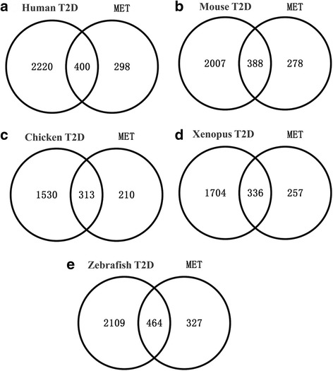 Fig. 3. Venn diagram of the relationship between carbohydrate/glucose metabolic genes and type 2 diabetes-associated genes. a Comparison of 698 human carbohydrate/glucose metabolic genes with 2620 human T2D-related genes (400 of 698 carbohydrate/glucose metabolic genes overlapped with T2D genes). b Similar to the phenomenon in human genes, 388 of 666 mouse carbohydrate/glucose metabolic genes were related to T2D. c In chicken, 313 carbohydrate/glucose metabolic genes were associated with T2D. d In frog, 336 carbohydrate/glucose metabolic genes overlapped with 2024 T2D-related genes. e Similarly, 464 zebrafish carbohydrate/glucose metabolic genes were involved in T2D. Abbreviation: MET- carbohydrate/glucose metabolism. All genes are shown in Additional file 6: Table S5