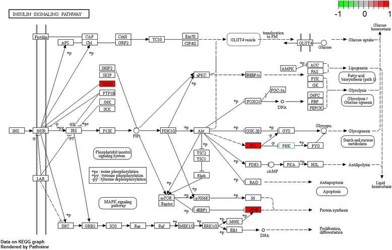 Fig. 4. The location of si:ch211-167b20.8, socs9, eif4e1c and CALML6 in the insulin signaling pathway. Zebrafish-specific si:ch211-167b20.8 and human-specific CALML6, encoding PP1 and PHK, respectively, which are two proteins that play opposite roles in insulin pathways. Zebrafish-specific genes are shaded in red, human-specific CALML6 is shown in the green box