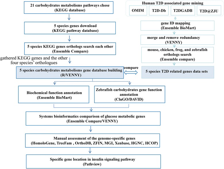 RESULTS: In this study, we first built a database containing 791, 593, 523, 666 and 698 carbohydrate/glucose metabolic genes from the genomes of Danio rerio, Xenopus tropicalis, Gallus gallus, Mus musculus and Homo sapiens, respectively, and most of these genes in our database are predicted to encode specific enzymes that play roles in defined reactions; over 57% of these genes are related to human type 2 diabetes. Then, we systematically compared these genes and found that more than 70% of the carbohydrate/glucose metabolic genes are conserved in the five species. Interestingly, there are 4 zebrafish-specific genes (si:ch211-167b20.8, CABZ01043017.1, socs9 and eif4e1c) and 1 human-specific gene (CALML6) that may alter glucose utilization in their corresponding species. Interestingly, these 5 genes are all carbohydrate regulation factors, but the enzymes themselves are involved in insulin regulation pathways. Lastly, in order to facilitate the use of our data sets, we constructed a glucose metabolism database platform ( http://101.200.43.1:10000/ ).