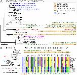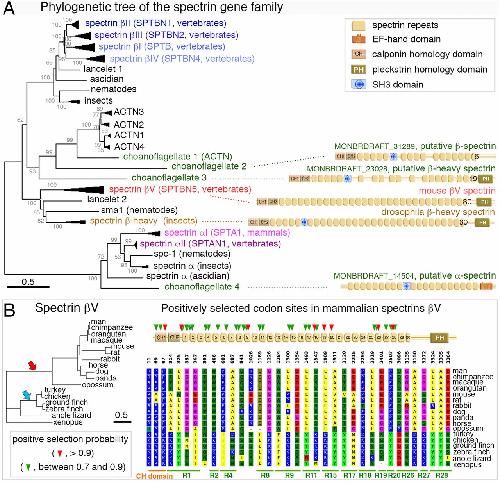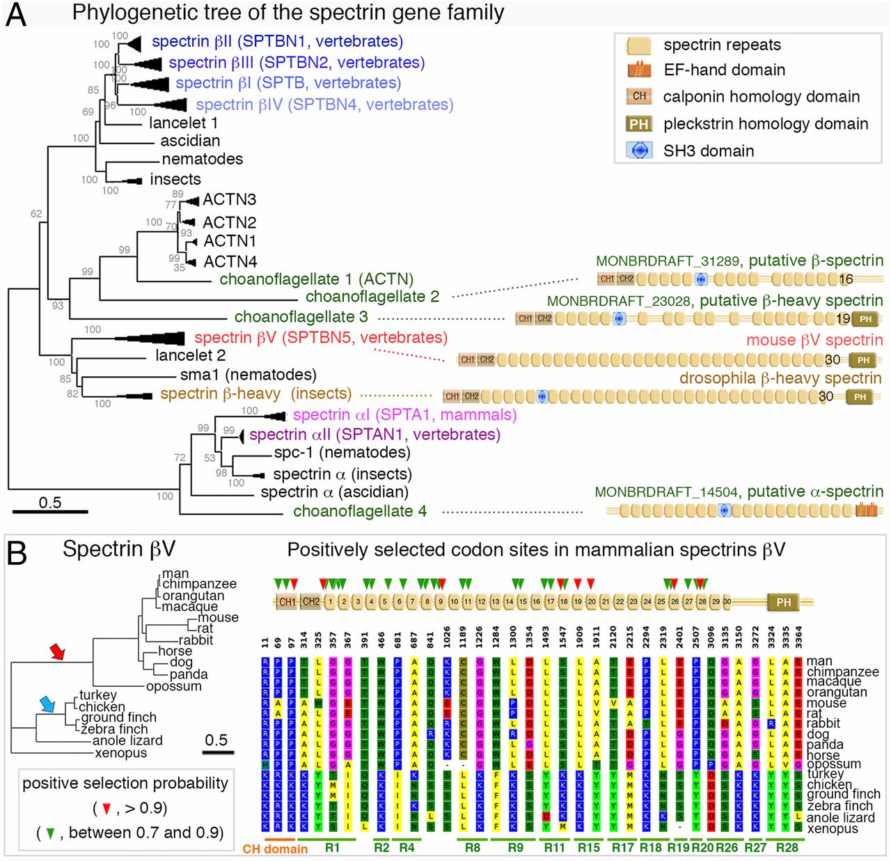 Spectrin family tree and signatures of positive selection in the amino acid sequences of mammalian spectrins βV. (A) Neighbor-joining phylogenetic tree of the complete spectrin gene family based on a multiple full-length sequence alignment from vertebrate and invertebrate species (Jones–Taylor–Thornton amino acid substitution model). Vertebrate spectrin branches were collapsed for the sake of clarity (see detailed tree in SI Appendix, Fig. S7). Predicted domains of the spectrins identified in the choanoflagellate Monosiga brevicollis are shown on the right side of the corresponding tree branches: MONBRDRAFT_14504, _31289, and _23028 refer to the putative α, β, and β-heavy (βH) spectrins, respectively. The nonconventional β spectrins of Drosophila (β-heavy) and mouse (βV) are shown for comparison. Bar, 0.5 substitution per site. (B) Diagram showing the positions of the amino acid residues submitted to positive selection in the mammalian lineage for spectrin βV (35 codon sites). Corresponding positions in the different vertebrate species are shown, with upper numbers indicating the positions in the human protein sequence. The protein domains are indicated below by horizontal bars. The phylogenetic tree of this spectrin is shown on the left side (the red and blue arrows indicate the mammalian and avian focal branches, respectively). Bar, 0.5 substitution per site. The detailed results of the phylogenic molecular analysis are presented in SI Appendix, Table S2. CH, calponin homology domain; Rn, spectrin repeat number n; PH, pleckstrin homology domain.