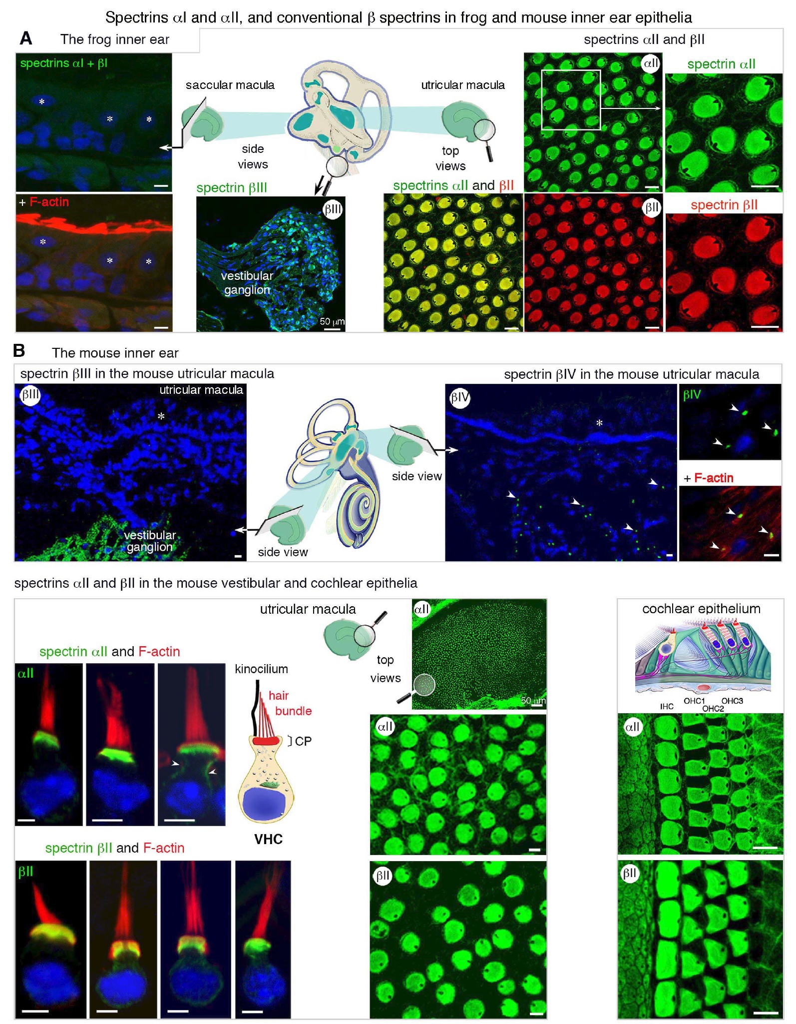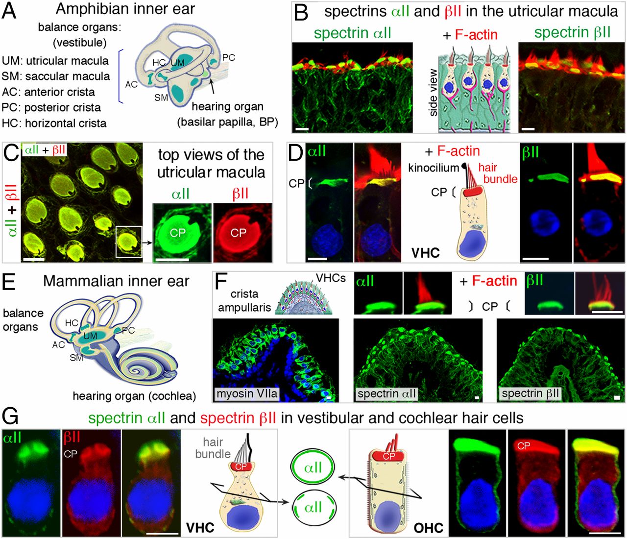 spectrins αII and βII, which are mainly detected in the apical region of hair cells, specifically in the