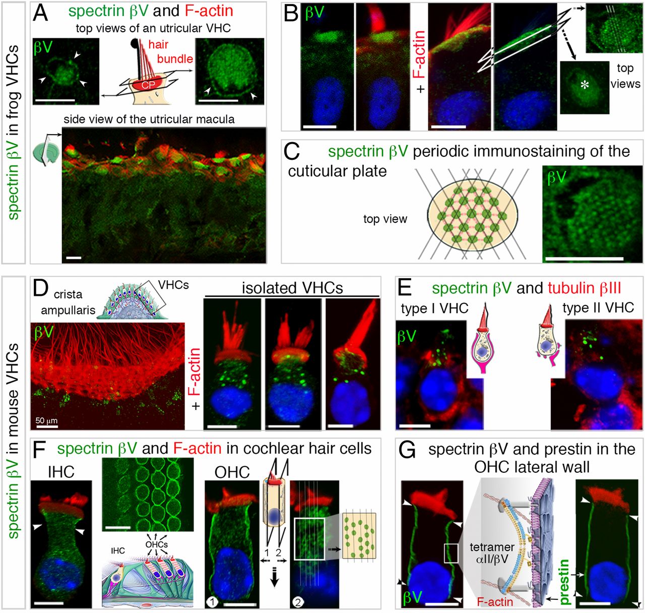 Distinct subcellular distributions of spectrin βV in the frog and mouse hair cells. (AâC) Frog (X. laevis). (A and B) In the vestibular hair cells (VHCs) of a frog utricular macula, spectrin βV (green) is invariably detected both in the cuticular plate (CP) and as an apical immunoreactive peripheral ring (arrowheads in A). The top views in B show spectrin βV labeling just above and under (asterisk) the cuticular plate. (C) At the CP apical surface, the spectrin βV immunostaining forms a well-organized punctate pattern, with seemingly uniformly spaced dots resembling lattice knots. (DâG) Mouse. (D and E) In the VHCs of a mouse crista ampullaris, spectrin βV is detected as a cytoplasmic punctate immunostaining both in type I and type II VHCs, which can be differentiated by the tubulin βIII immunolabeling of their afferent nerve fibers. Spectrin βV-immunoreactive puncta extend from the apical region near the cuticular plate down to the supranuclear region of the VHCs. (F and G) In the cochlea, spectrin βV is present both in inner hair cells (IHCs) and outer hair cells (OHCs). Note that the immunostaining of the IHC lateral wall is restricted to the neck region (arrowheads), whereas the protein is detected in (and restricted to) the entire lateral wall of OHCs, where it contributes to the cortical lattice (see diagrams) (F). (G) In the OHCs, the spectrin βV immunostaining matches the distribution of the lateral plasma membrane protein prestin (arrowheads). Bars, 5 µm.