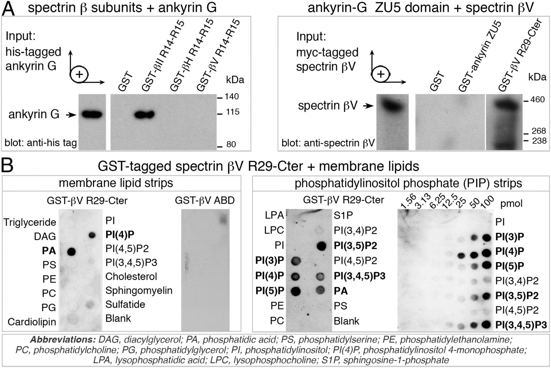 Direct interaction of spectrin βV with membrane phospholipids, but not with ankyrin G. (A) Spectrin-ankyrin interaction. (Left) Purified His-tagged ankyrin G binds to a GST-tagged R14-R15 fragment of spectrin βII (GST-βII R14-R15), but not to GST-tagged R14-R15 fragments of the human spectrin βV (GST-βV R14-R15) or Drosophila spectrin βH (GST-βH R14-R15). (Right) In the reciprocal experiment, the GST-tagged ZU5 domain of ankyrin G (GST-ankyrin ZU5) does not bind to the myc-tagged full-length human spectrin βV. Homodimerization of spectrin βV through its C-terminal region (R29-Cter) was used as a positive control (17). (B) Spectrin-membrane interaction. In a membrane lipid strip assay, the R29-Cter fragment of spectrin βV, but not its actin-binding domain (βV ABD), binds to phosphatidic acid (PA) and phosphatidylinositol 4-monophosphate [PI(4)P]. In the PIP strip assay, the βV R29-Cter peptide binds to PI(3)P, PI(4)P, and PI(5)P, to PI(3,5)P2, and to PI(3,4,5)P3.